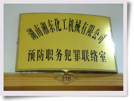 5月5日上午,攸縣檢察院領(lǐng)導(dǎo)到公司為“預(yù)防職務(wù)犯罪聯(lián)絡(luò)室”揭牌。 多年來,公司堅(jiān)持教育中層以上干部和相關(guān)人員,預(yù)防職務(wù)犯罪。今年,公司聘請了縣檢察院瀆職科領(lǐng)導(dǎo)到公司授課培訓(xùn),讓廣大干部和相關(guān)人員熟悉相關(guān)法律知識,從而實(shí)現(xiàn)了廣大干部按原則辦事,為湘東化機(jī)發(fā)展作貢獻(xiàn)的目標(biāo)。近十年來取得了很好的效果,公司未出現(xiàn)一例職務(wù)犯罪現(xiàn)象。