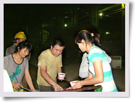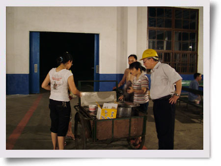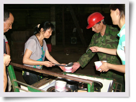 圖為7月21日晚上9點(diǎn)多鐘公司辦公室的員工在不銹鋼分廠等車間送冰綠豆粥的現(xiàn)場。(王慧卉)