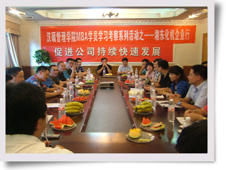 2010年8月14日,湘東化機(jī)迎來(lái)了漢碩管理學(xué)院領(lǐng)導(dǎo)和國(guó)際亞公大MBA十八班學(xué)員參觀交流。 漢碩管理學(xué)院是2000年經(jīng)湖南省教育廳批準(zhǔn)成立的高等院校,學(xué)院逐步發(fā)展為以MBA、EMBA、EDP(高層管理培訓(xùn))教育為主的高等教育機(jī)構(gòu),先后合作培養(yǎng)了碩士或相當(dāng)于碩士研究生同等學(xué)歷的在職研究生(含未畢業(yè)學(xué)員)逾2000人。湘東化機(jī)公司非常重視對(duì)領(lǐng)導(dǎo)干部的培訓(xùn),自漢碩管理學(xué)院開(kāi)班起已相繼派出了8名學(xué)員進(jìn)修學(xué)習(xí)。 一行人先后參觀了汽輪機(jī)、金工、容器車間,不時(shí)詢問(wèn)各種設(shè)備的用途、原理等情況,陪同的分廠廠長(zhǎng)作了詳細(xì)介紹。參觀結(jié)束后在公司辦公樓二樓大會(huì)議室召開(kāi)了座談會(huì),公司董事長(zhǎng)兼總經(jīng)理蘇成,副總經(jīng)理徐元?dú)J、姜衡陽(yáng)、陽(yáng)熱平及相關(guān)部門領(lǐng)導(dǎo)出席了座談會(huì)。會(huì)上蘇總首先發(fā)言歡迎各位漢碩管理學(xué)院領(lǐng)導(dǎo)及學(xué)員的到來(lái),并簡(jiǎn)單介紹了公司的發(fā)展過(guò)程及現(xiàn)狀,最后就“如何設(shè)計(jì)薪酬激勵(lì)”及“如何提升企業(yè)的執(zhí)行力”兩個(gè)主題進(jìn)行了積極交流。會(huì)上,漢碩管理學(xué)院為公司頒發(fā)了“漢碩管理學(xué)院MBA實(shí)踐基地”證書。