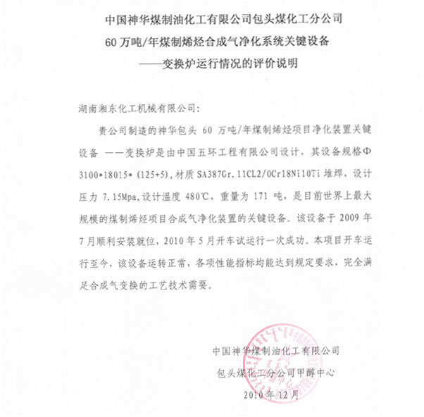 近日,中國神華煤制油化工有限公司包頭煤化工分公司甲醇中心在對我公司發(fā)來的賀信中說到: