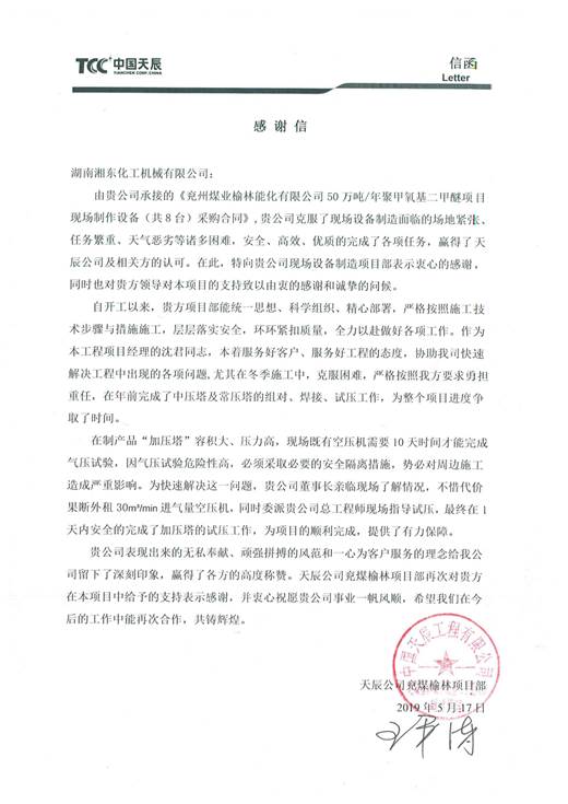 近日,我公司收到中國天辰有限公司兗煤榆林項(xiàng)目部感謝信,天辰公司為我公司提前圓滿完成榆林項(xiàng)目而表示感謝,全文如下: